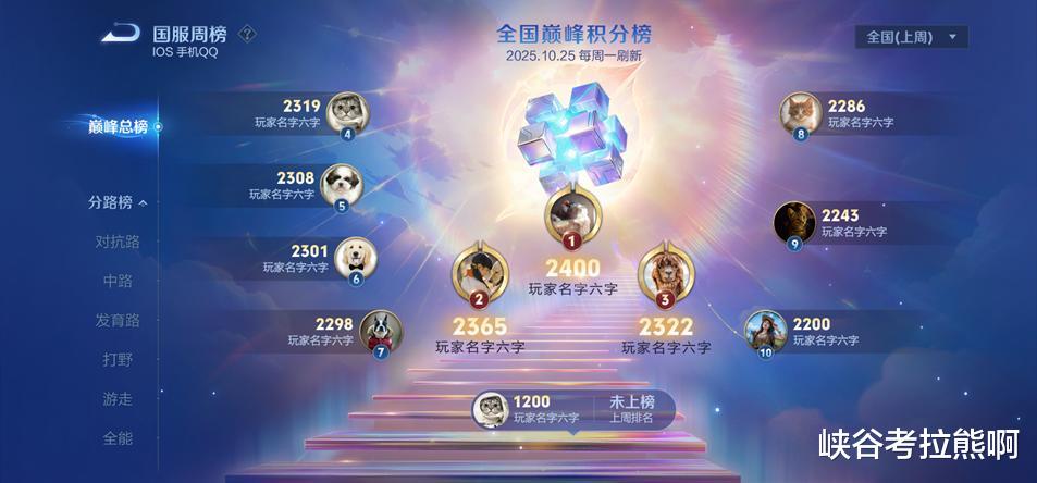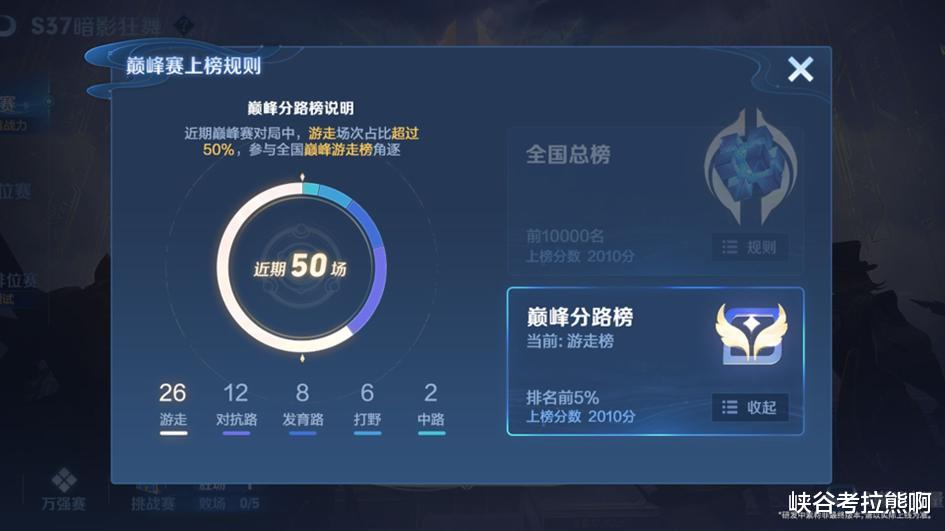 巅峰分路榜还会保留,并将细化为对抗路、中路、发育路、游走、打野、全能6个子榜单,超过1400分即可参与,数据会按照近期50场巅峰赛对局分来统计。如果50场对局中有某个分路场次超过50%,就会参与该分路排名,如果没有分路超过50%,就会按照全能来排名。