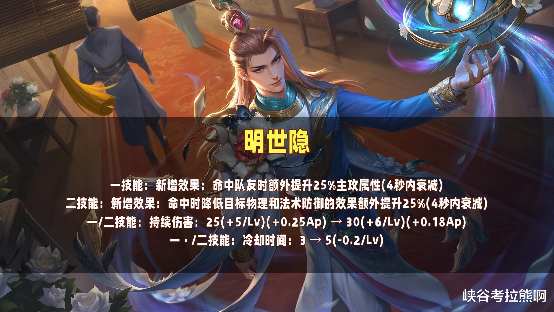 明世隐(平衡调整):一技能新增命中队友时额外提升25%主公属性(4秒内衰减),二技能新增命中敌方时降低其25%双抗的效果额外提升25%(4秒内衰减)。代价为一二技能持续伤害降低,冷却时间提高2~1秒。