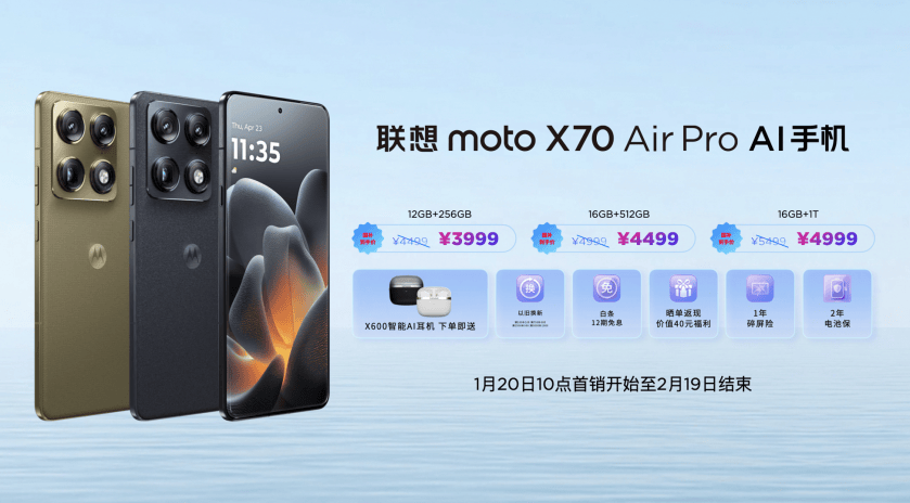 联想moto X70 Air Pro AI手机价格为4499元起,国补到手价仅3999元起。首销期间,除上述四重权益之外,还额外赠送1年碎屏险和2年电池保的安心服务。同时,在京东官方店铺下单X70 Air Pro的用户即有机会参与抽奖,赢取国家地理同款路线双人游名额;在首销月内完成指定景点打卡任务,还有机会获得千元现金红包。