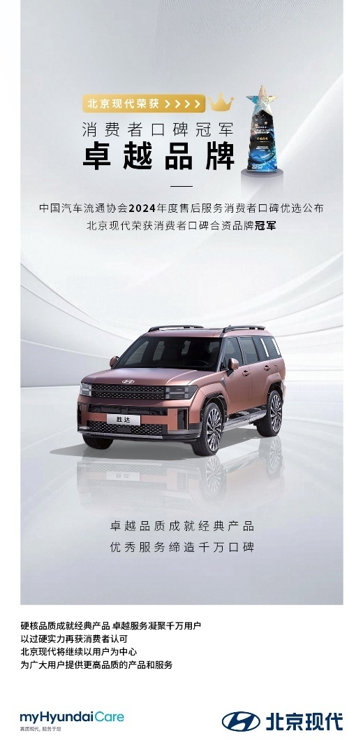 荣誉,是激励,更是鞭策。北京现代能够再次荣获中国汽车流通协会售后服务消费者口碑-卓越品牌大奖,是北京现代千万用户用口碑为品牌投下的信任票,更是北京现代坚持以用户为中心,创新服务模式、优化服务体验的结果。未来,北京现代将继续围绕用户需求进行服务创新,升级出行体验,为中国汽车服务生态高质量发展注入强劲动能。
