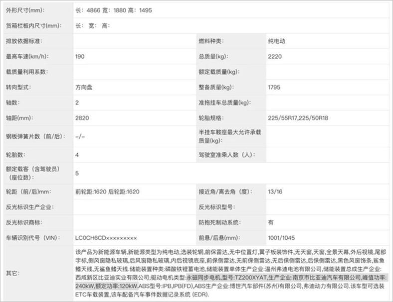 根据申报的信息,这款车长宽高分别为4866/1880/1495mm,轴距为2820mm。这款车并没有采用小米SU7等国产车型的“532”车身,而是更接近特斯拉Model 3的大小,这意味着将与国产主流车型错位竞争,或者说让这个赛道更平民化一些。并且,这个车身尺寸对于纯电动车并小,大家熟悉的秦PLUS EV的轴距为2718mm,而秦MAX长了102mm。据称,这款车的车内空间利用率达84.8%。