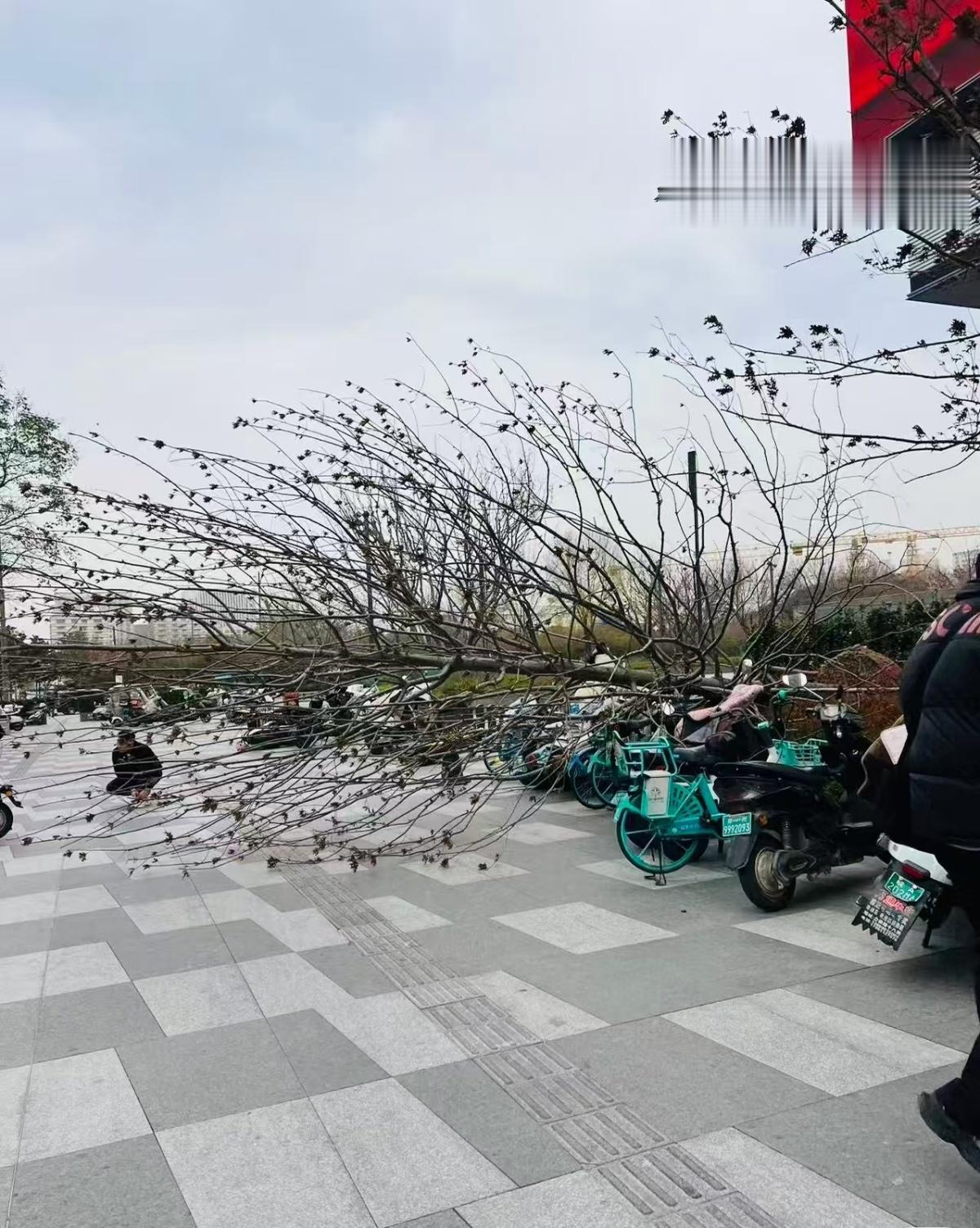 在郑东新区万象城附近,一棵行道树也被连根拔起,引来不少行人围观。而在城市的许多角落,被吹断的树枝散落一地,成了环卫工人们今天最棘手的工作。