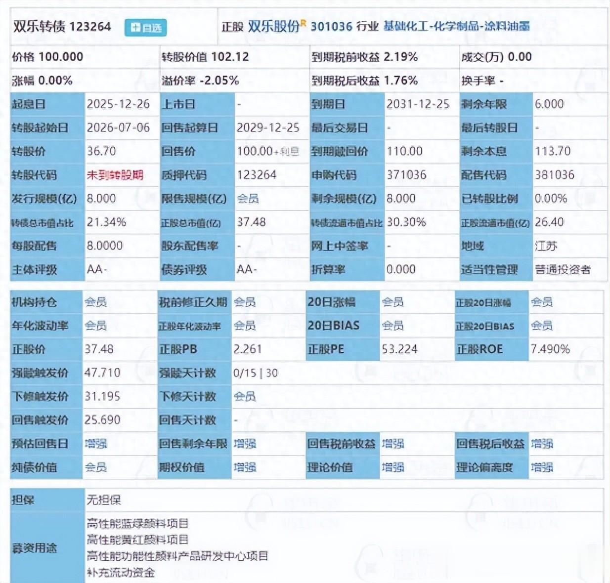 根据当前市场情绪及可转债交易行情,双乐转债上市时预计会有32%的溢价,预估上市价值为135元。