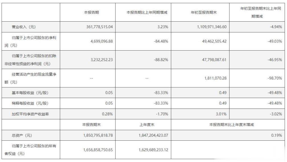 2025年前三季度公司实现营业收入1109971346.6元,同比减少4.94%;实现归属于母公司所有者的净利润为49462505.42元,同比减少49.03%;实现归属于母公司所有者的扣除非经常性损益的净利润为47798087.61元,同比减少46.95%。