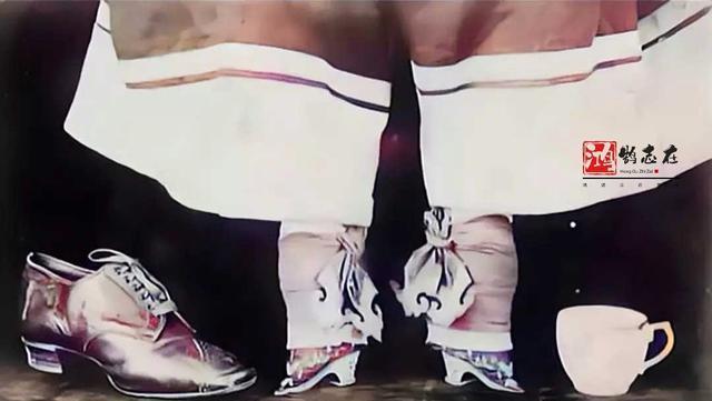 拍照的人想搞点新奇玩意儿,左边搁了只皮靴,右边放了个水杯,一眼瞅过去,确实挺让人吃惊。但想想那时候的大清朝末年,缠足这事儿可太流行了,女人们为了讨男人欢心,那真是把脚骨都变形得跟连一块儿了似的。