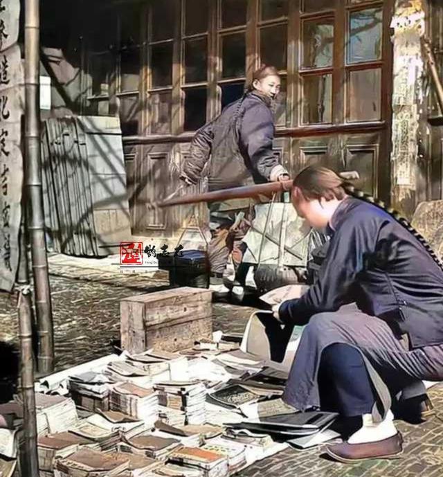 在那个书摊上,有个留着长辫子的男士正在挑书。现在那些线装书可都老值钱了,但那时候在书摊上,它们就是些常见的货色。想要从里面挑到一本好书,那真的得有点眼光才行。