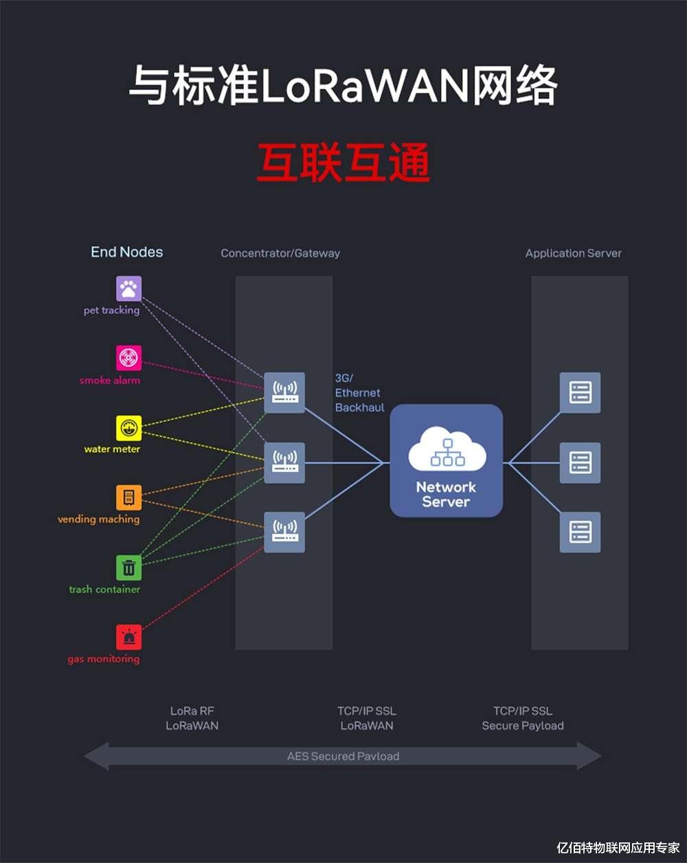 标准LoRaWAN,互联互通遵循标准LoRaWAN协议,支持CN470、EU868、US915等多地区频段