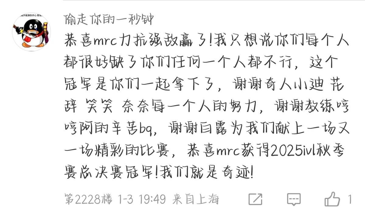 少年驰骋赛场,热血铸就篇章。MRC经历过常规赛十一连败的低谷,尝过季后赛不敌对手的遗憾,更曾沐浴过“金色雨”的荣光。而今,他们再度登顶,用实力证明,这个总决赛,MRC就是“胜利”的代名词!最后,再次恭喜MRC战队获得2025IVL秋季赛总决赛冠军!