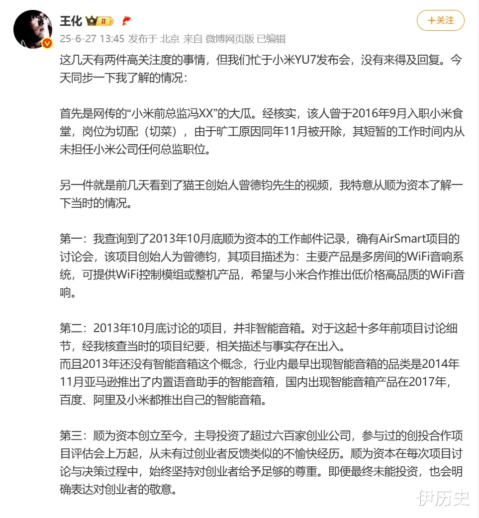 可笑吗?真可笑。就在所有人都在讨论这个“总监”的商业模式多么牛X,风控体系多么严谨的时候,小米公司公关部总经理王化下场了,一句话把所有人的脸都打肿了:经核实,该人曾于2016年9月入职小米食堂,岗位为切配(切菜),由于旷工原因同年11月被开除,从未担任小米公司任何总监职位。
