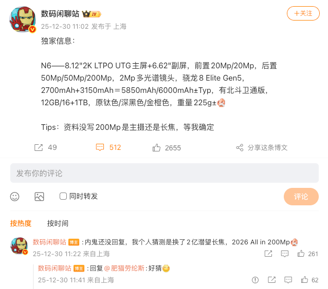 至于配置,数码闲聊站也透露了骁龙8Elite Gen5,电池容量也超6000mAh、影像部分更是有多光谱色彩传感器,就等一波官宣了。