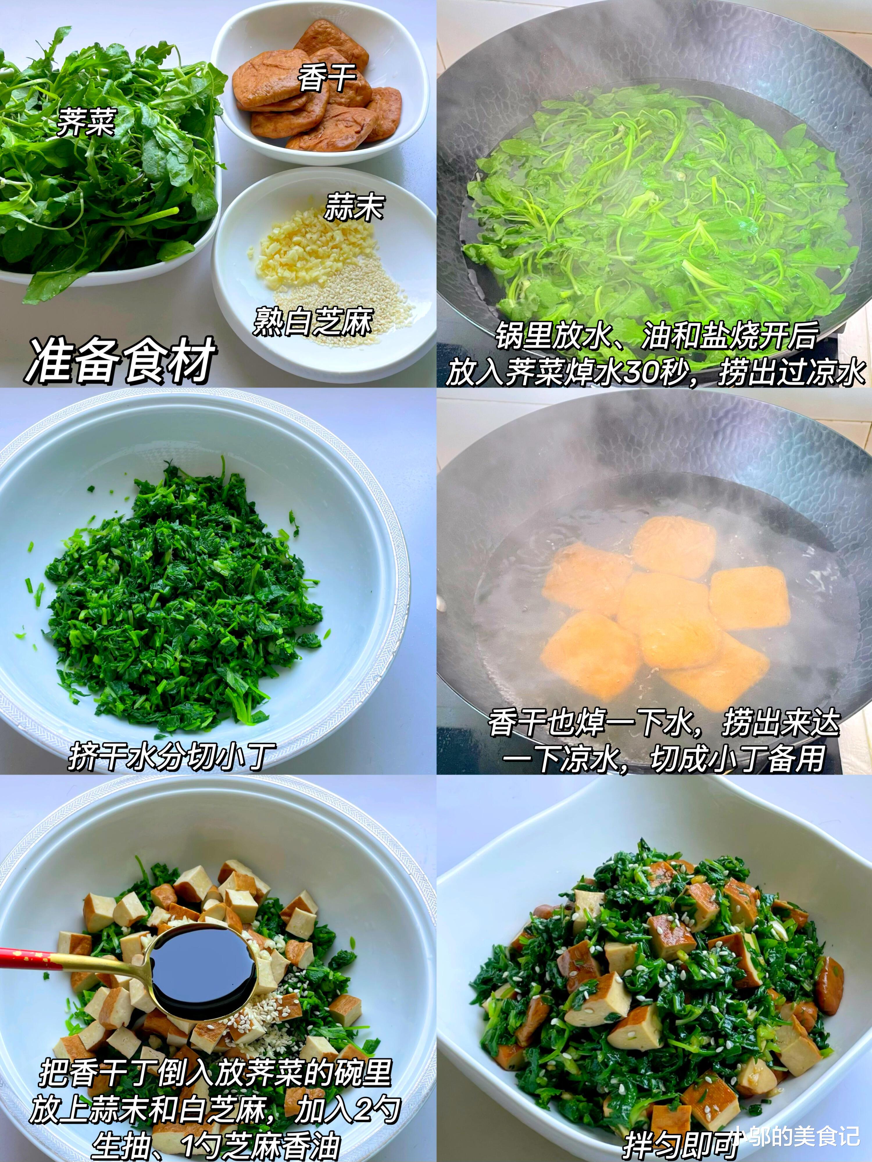 做这道菜,食材准备得越新鲜,成品就越动人。去市场挑荠菜,要选那种叶片嫩、根部白、没有开花的,拿在手里闻一闻,有股清清爽爽的草香才是上品。香干则选紧实有弹性的,太松散的容易碎,最好是微微泛黄的传统豆干,豆香味更浓。备上几瓣大蒜、一把熟白芝麻,调料只用生抽和香油,多一样都是对春天原味的打扰。