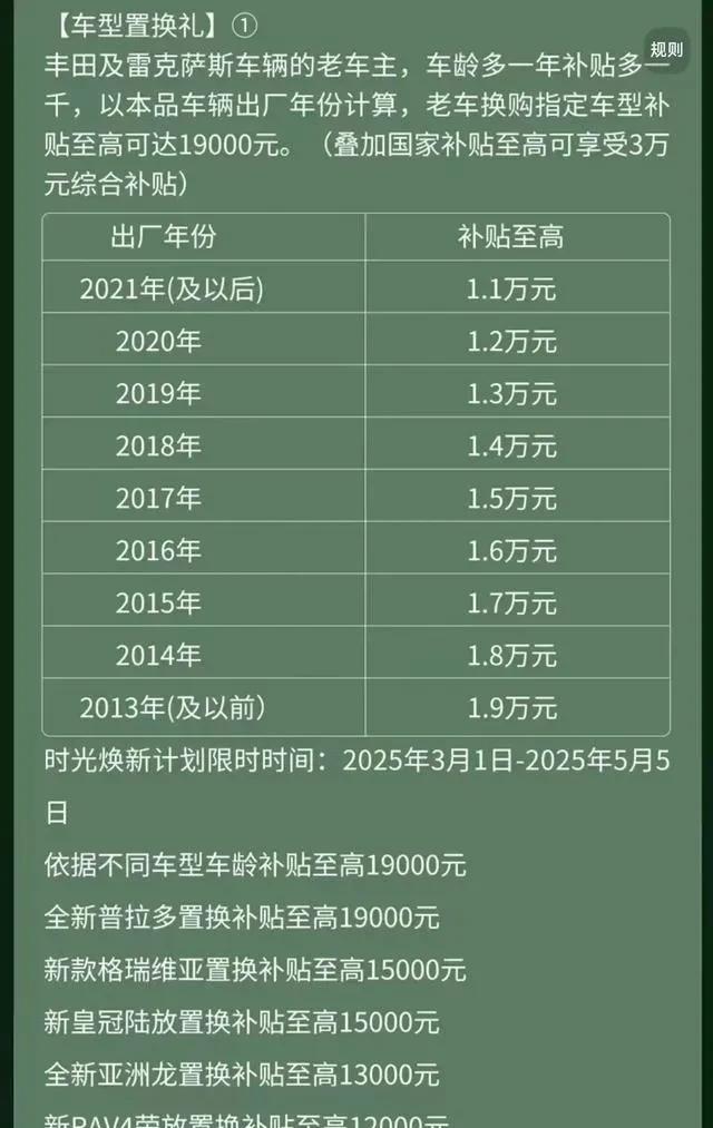 以老车主为例,假如你已经驾驶了一辆丰田车型超过十年,按照这一新政策,车龄的增加会让你的旧车在置换时更值钱。例如,对于一位车龄为13年的老车主,他们可以享受到基于车龄的15000元补贴,加上国家的补贴,总体优惠可达到30000元以上。这样的实惠无疑让老车主们感到欢欣鼓舞,仿佛自己多年的坚持和信赖得到了回报。