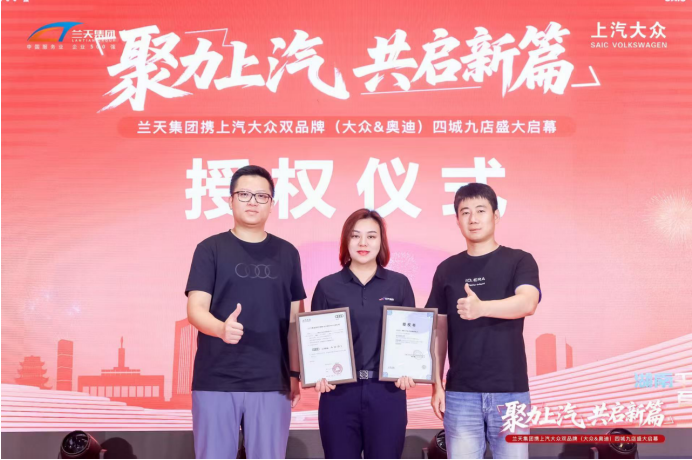 在核心仪式环节,上汽大众汽车有限公司大众品牌营销事业执行总监李俊、上汽奥迪营销事业部零售与区域营销高级总监范广元向兰天集团副总裁黄琼正式授予品牌授权书。此次兰天集团九店同开,将兰天集团将进一步推动双品牌(大众&奥迪)在中南市场的渠道下沉与消费渗透。