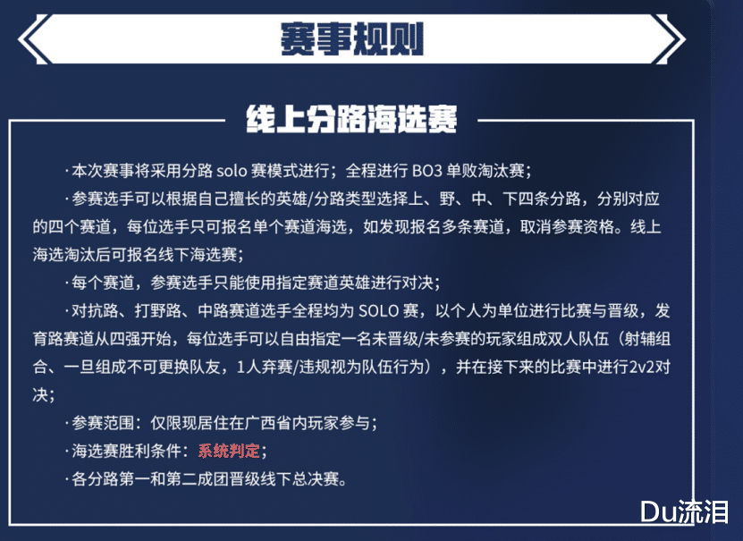 比赛的规则是单挑,注意只有上、野、中、下四条分路,没有辅助。选手只能选择一条赛道参与比赛,你英雄池深就选择一条拿手的赛道,如果多赛道报名,官方会取消你的参赛资格。官方为不同赛道规定了对应的英雄,你不能用射手英雄去打对抗路,这样玩就没意思了。大家参赛之前,一定要看好对应赛道中的英雄池,选择几个最拿手的英雄参赛。