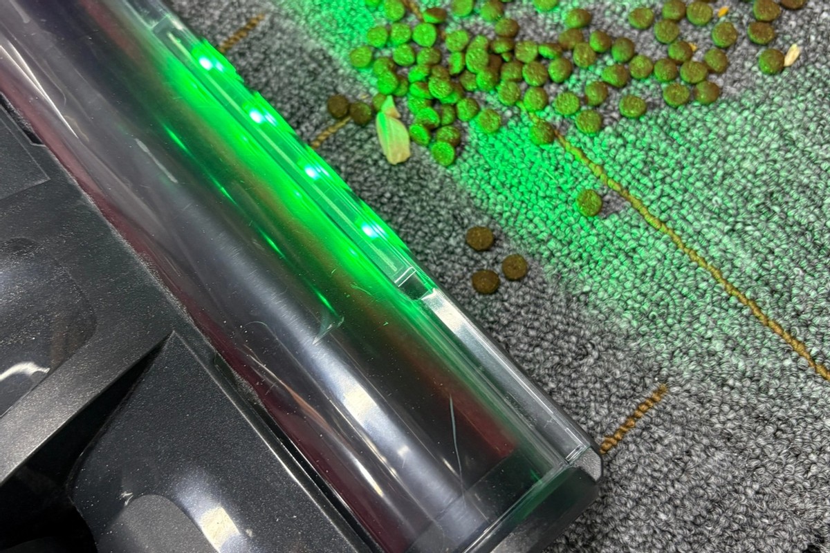 以前我觉得吸地不用灯,后来用了绿光显尘才发现家里有多脏。普通室内灯光是漫反射,灰尘也是浅色的,根本看不清。绿光显尘利用了人眼对绿色敏感的特性,把灰尘的影子拉长。这就像开了透视一样,哪脏吸哪。没有这个功能,吸地就是在做随机运动,看着挺累,实际根本没吸干净,效率极低。