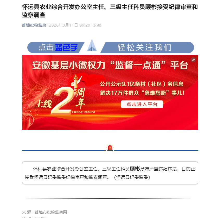 然其久居利薮,心渐生蠹。以“老资格”自恃,视专业壁垒为护符,将惠民工程作私产。细察其权,皆成弊窟:一曰项目审批“笔定乾坤”。何乡何村可建高标准农田,规划设计孰优孰劣,其建议几同决定,承包商竞相“围猎”。二曰资金管理“水阀暗控”。中央及省拨巨款,其笔尖松紧,直接关乎施工方之血脉,拖延支付、“吃拿卡要”遂成常技。三曰工程验收“橡皮图章”。质量达标与否,尾款支付快慢,皆可高抬贵手,使不合格工程蒙混过关,国家投入付诸东流。四曰“三资”领域擦边渔利。土地整合、集体资产处置,信息不对称间,易为个人及关系人谋利。尤可骇者,乙巳年(2025)七月至九月,怀远县委第二巡察组对县农业农村局(含其办公室)开展巡察“回头看”,专项剑指“农村集体‘三资’管理、乡村振兴资金使用监管、高标准农田建设管理领域”。巡察利剑悬顶,其弊已现端倪。越半载,至丙午年二月初二日(2026年3月11日),怀远县纪委监委终发公告:顾彬涉嫌严重违纪违法,接受纪律审查与监察调查。二十六年本土路,竟以“塌方”告终;终日经手“阳光工程”,自身却未能守住“廉洁底线”。