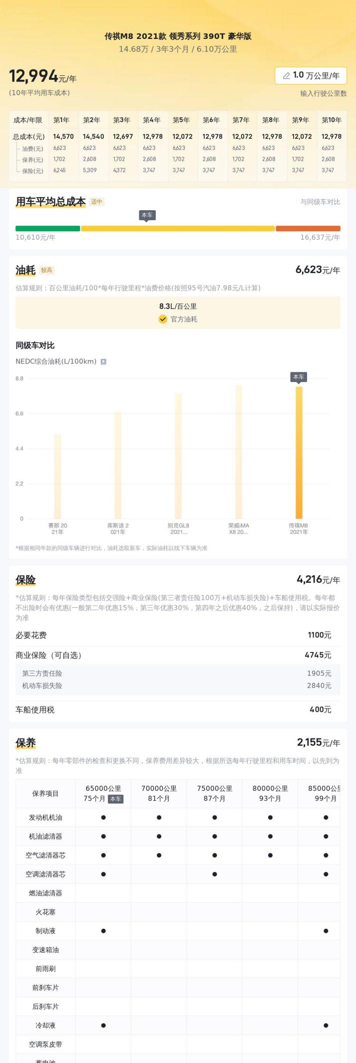 购买二手车,除了车况和价格,还要考虑后期的使用成本。例如,燃油费、保养费、保险费等等。根据目前的行情估算,这辆传祺M8每年的使用成本大约在1.5万到2万元之间,具体费用会根据实际使用情况而有所差异。