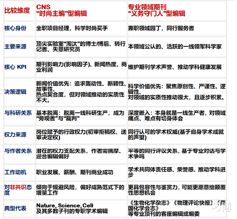 一个尖锐的问题随之浮现:这些由“淘汰者”转型、手握重权的CNS“太上皇”编辑,与那些依然活跃在科研一线、以“义务劳动”形式担任专业领域期刊编辑的科学家相比,在素养、动机与决策逻辑上,是否存在天壤之别?答案是肯定的。这种差异,正是理解CNS与真正专业学术期刊在科学价值筛选上分道扬镳的底层逻辑。