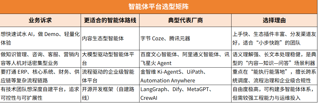 这些工具在技术团队中增长迅速,但也都存在一个明确的前提:企业必须具备内部AI工程团队。所以在中大型企业中,常见的做法是用商业平台做“骨架与治理”,用开源框架做“灵活补充”,最终组合成企业级智能体体系。