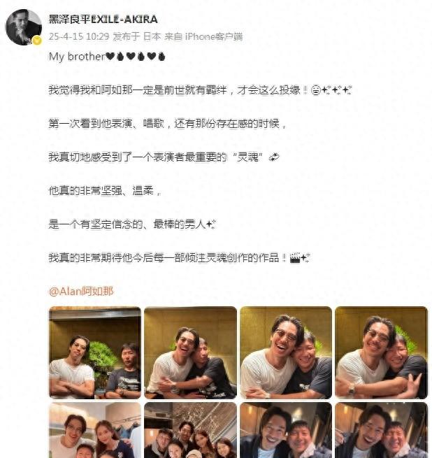 4月15日,黑泽良平在社交平台分享了一组聚会照片,照片中他和好友阿如那亲密合影,展现了两人深厚的兄弟情谊。
