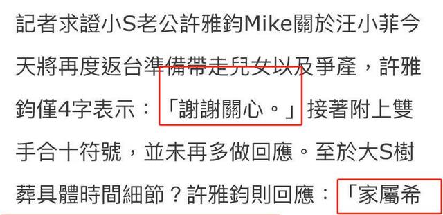 当媒体询问汪小菲返台是否与孩子和遗产有关时,许雅钧只是简单回应了四个字:“谢谢关心”,随后便不再多说。