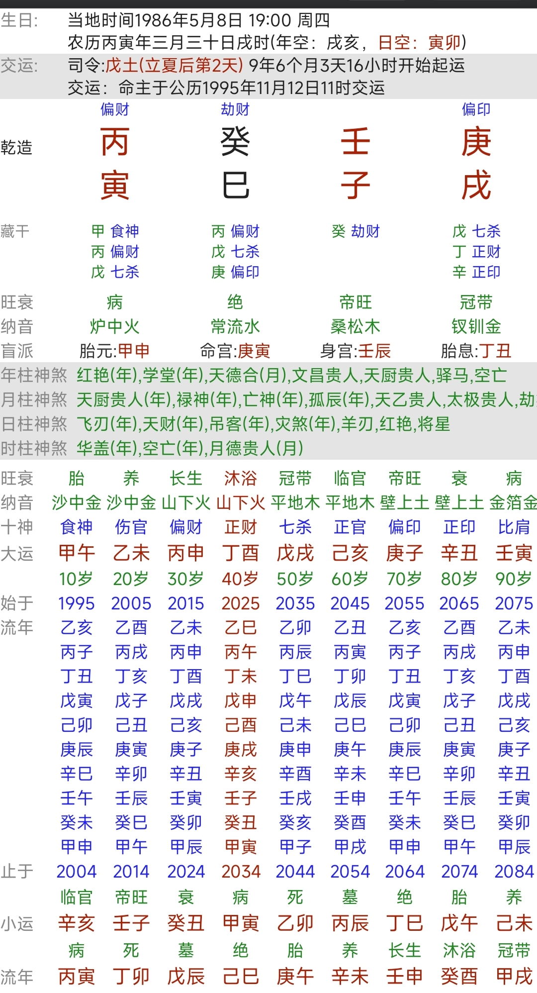 前十年走丙申大运,运支申金被丙火盖头,与原局构成了寅巳申三刑。走三刑大运,心事都非常的重,而且容易犯小人,口舌是非,并且也容易做错事,因盲目投资负债。所以这十年并不顺利,波折也是很大的,在工作或感情上面都不是很顺利。