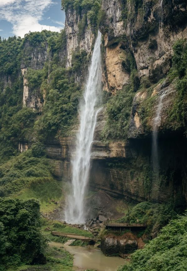 船随水转,景随船移。两岸是壁立千仞的悬崖绝壁,呈现出赭红、灰白、黛青等多种色彩,那是亿万年来地质运动的层叠日记。岩壁上顽强生长着姿态各异的树木与藤蔓,为冷硬的石崖增添了蓬勃的生命力。时而可见瀑布如白练般从高高的崖顶飘洒而下,有的细若游丝,有的则汇成溪流,注入碧江,发出泠泠清响。仰望天空,它被峡谷裁剪成一条蜿蜒的蓝色飘带,几缕白云恰到好处地点缀其间。这种被巨大山体温柔包围、在窄窄水路上前行的感觉,既有些许压迫感,又充满探索的奇趣。