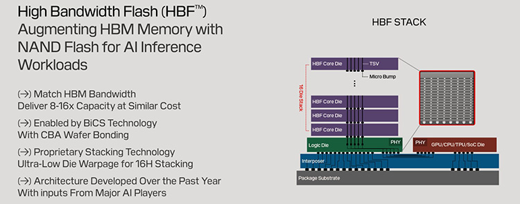 HBF并非是HBM的替代品,而是介于HBM和SSD之间的全新层级。容量上比HBM大得多(8-16 倍),带宽又远高于SSD的中间层,同时成本上还比HBM低得多。它可以直接与AI服务器紧密集成,就像一个超大容量的“近处理器缓存”,让服务器能快速访问海量数据,减少等待SSD的时间。