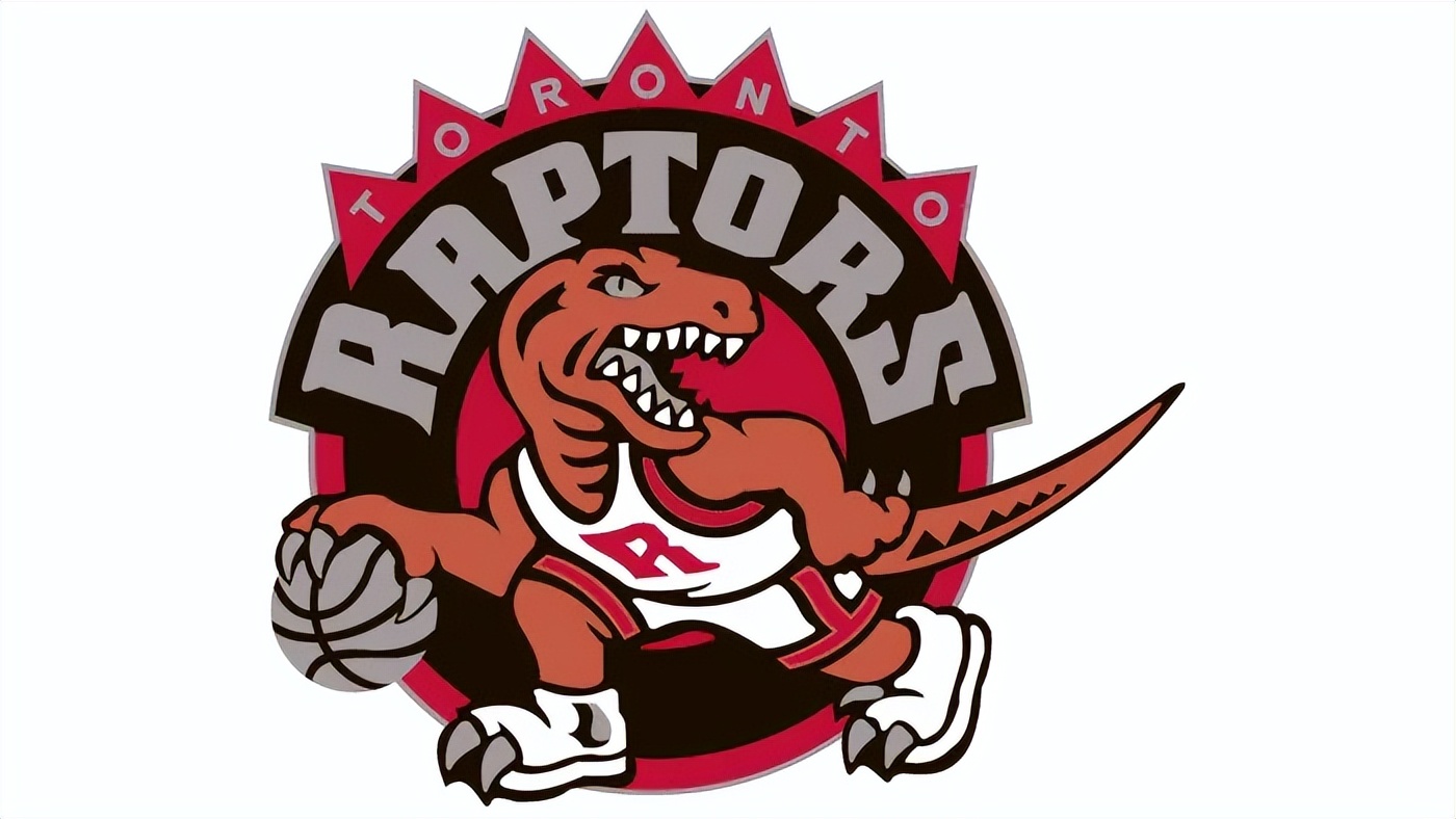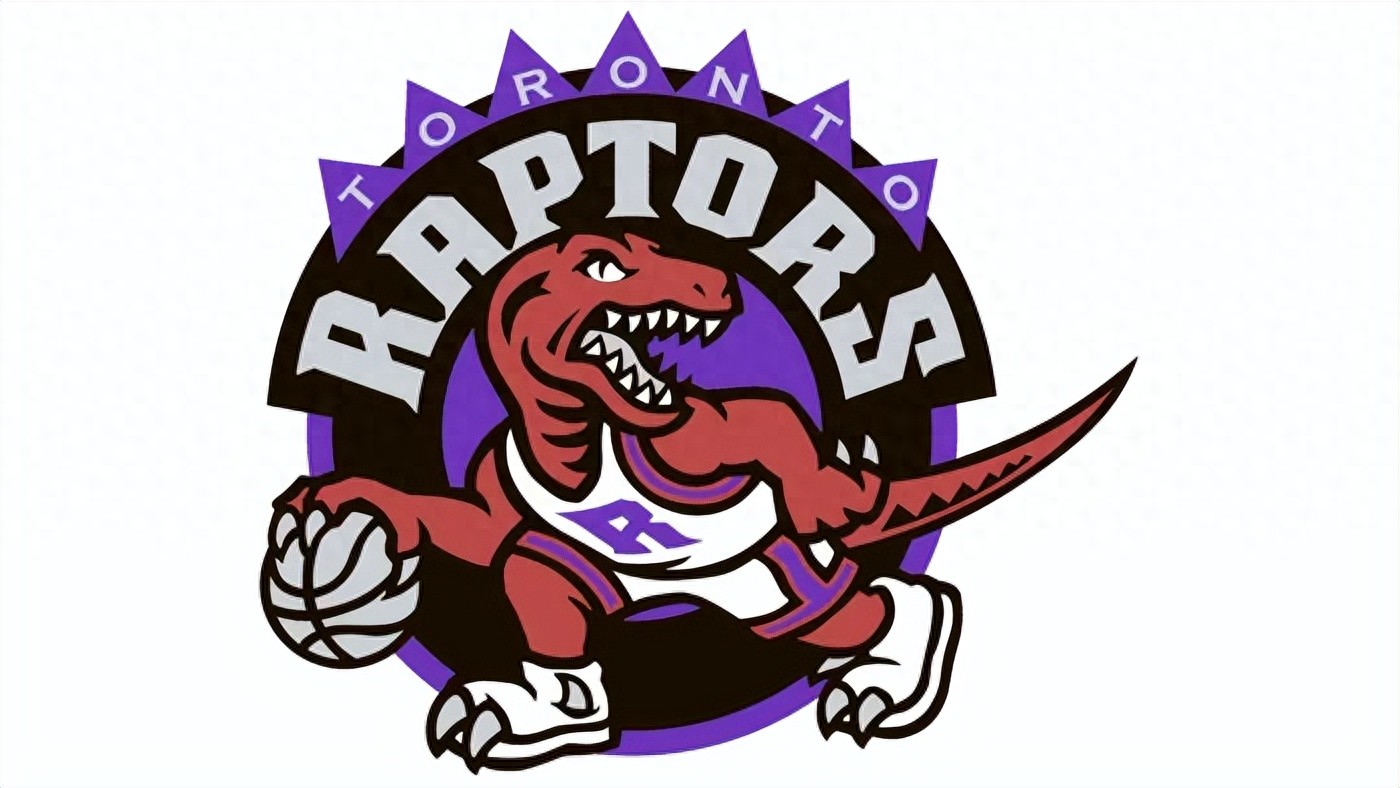 这只红色恐龙身着白色运动装备——短裤和胸前印有字母“R”的T恤。它运球前行,回头望向自己的脚——那双带有两个突出爪子的运动鞋。长长的尾巴远远延伸至队徽之外。顶部是弧形的“Raptors”字样,其上方以更小的字体写着“Toronto”。队徽中还包含紫色线条、圆圈和尖刺元素。