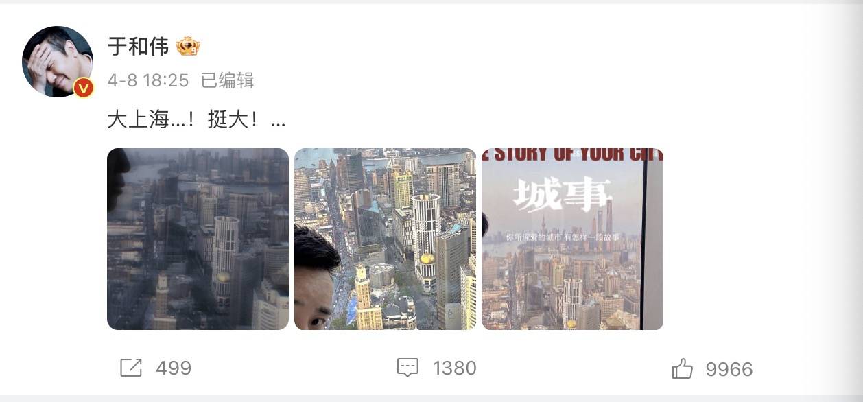 工作之外,于老师也会经常在微博上分享自己的生活趣闻。他会在城中小巷中边休息边观察行走的路人,会化身“街溜子”扎入成都人潮流动的街头,会在上海观赏各类建筑美景,也会为自己登上《新闻联播》的画面而感到激动。可见,于老师在拍戏之余并没有脱离生活,而是始终观察着周围的人与事,并将所思所想运用到表演里的角色塑造中。