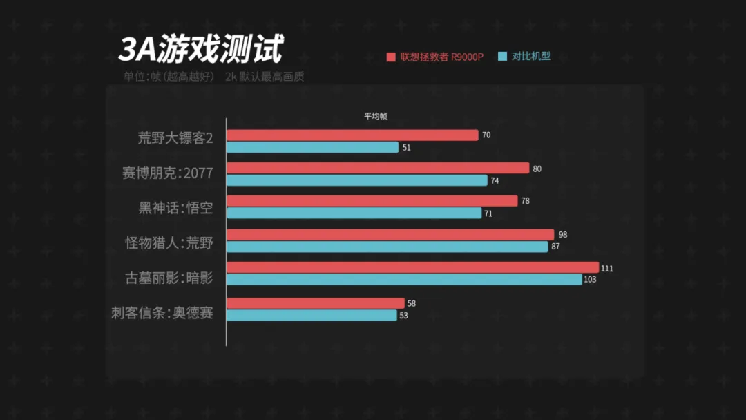 而在《荒野大镖客2》《赛博朋克2077》这类对GPU渲染与CPU计算要求都极高的3A游戏中,平均帧率的差距相对收敛,但帧率差异依然存在,特别是《荒野大镖客2》在2K分辨率下拉出了巨大的帧数差距。在城镇、复杂地形或大量AI同时运算的场景下,更强的CPU能够有效减少帧率骤降,避免破坏沉浸感。这种差异往往不只体现在平均帧数上,还会在长时间游玩中被反复感知。可以看到,R9000P在《荒野大镖客2》2K分辨率下下分别领先了37%。