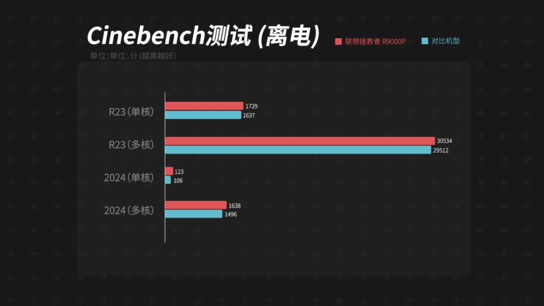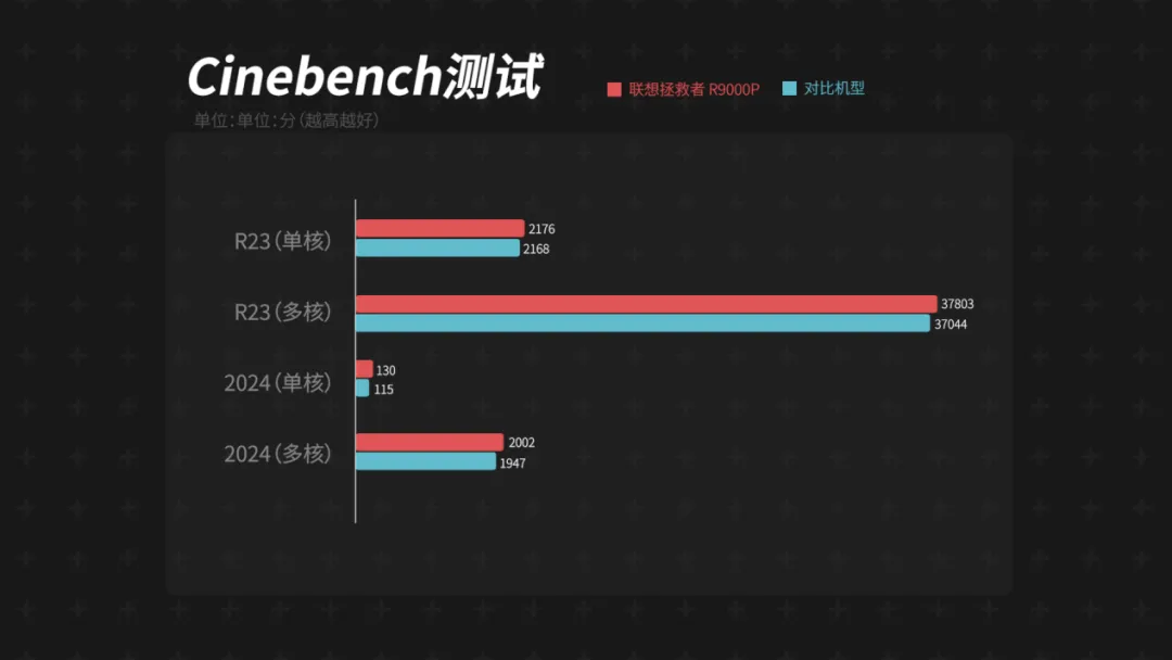 在Cinebench R23多核测试中,联想拯救者R9000P在插电状态下取得了超过37800分的成绩,整体表现明显领先于对比机型。这一成绩并不只是好看的数字,而是反映了其在高负载并行任务中的真实能力。在视频剪辑导出、3D渲染、程序编译等典型多线程任务中,更高的多核性能意味着更短的等待时间,也意味着用户在实际工作流程中更少被打断。