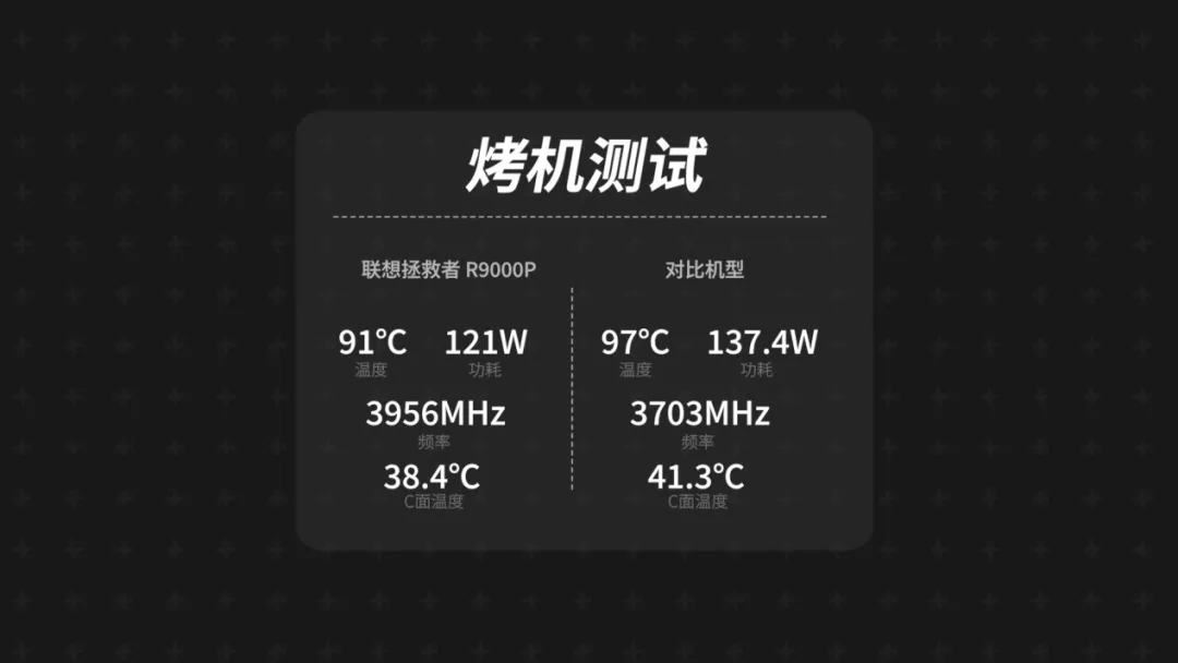 在单烤CPU的极限测试中,R9000P展现出的能效表现尤为突出。在持续满载状态下,其CPU以约121W的功耗,维持了接近3.95GHz的运行频率,核心温度稳定在91℃左右。作为对比,参照机型需要约137W的功耗,核心温度接近97℃,但频率反而更低。