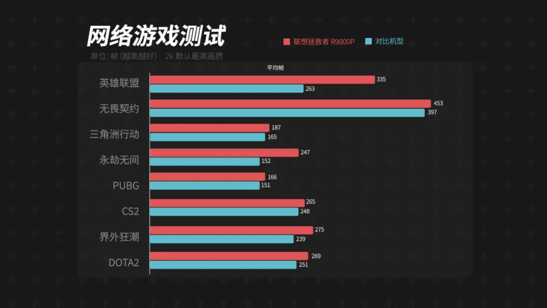 在《英雄联盟》《无畏契约》等电竞类游戏中,CPU需要在极短时间内处理大量角色状态、技能判定以及网络同步信息。测试结果显示,拯救者R9000P在这些场景中取得了明显更高的平均帧率。不管是更吃单核性能的《无畏契约》《CS2》,还是更吃多核性能的《界外狂潮》等游戏,AMD CPU都稳稳占据领先优势,这意味着CPU在高频、低延迟任务中的调度效率更高,显卡几乎不会出现等待数据的情况,从而持续输出高帧率画面。