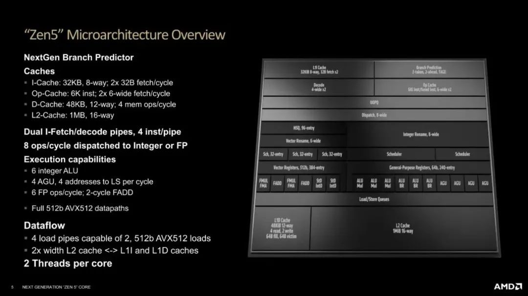 与上一代Zen4相比,Zen5在前端调度、执行单元布局以及分支预测精度等方面进行了系统性的调整。更合理的流水线划分,使得指令在执行过程中的等待时间被进一步压缩;更精准的分支预测,则减少了错误预测带来的流水线清空,从而提高整体执行效率。同时,Zen5对指令缓存和数据缓存结构进行了重新设计,在保持容量合理的前提下,降低了访问延迟,这对高频、碎片化任务尤为重要。