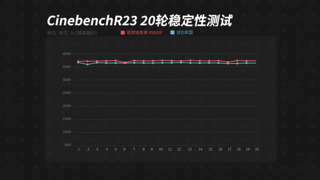 在连续20轮Cinebench R23多核压力测试中,拯救者R9000P的得分曲线表现得相当平稳,持续高输出的前提下几乎没有出现因温度或功耗限制导致的明显下滑。这说明其在散热设计和功耗调度方面,已经针对高负载场景进行了较为成熟的平衡。