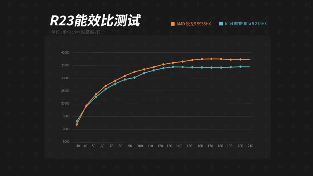 在从40W到210W的整个功耗区间内,锐龙9 9955HX的能效曲线全程位于对比机型之上。这意味着,在消耗相同功耗的情况下,锐龙9 9955HX始终能提供更高的性能输出,尤其是120W时的性能是高于竞品140W性能输出的。值得注意的是,锐龙9 9955HX在50W至120W这一笔记本最常用、也最关键的功耗区间内,其能效优势最为显著。