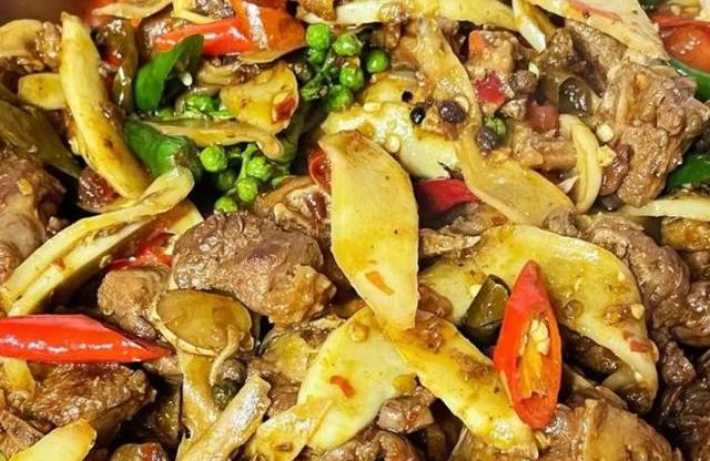 第四步,爆炒鸭肉。将腌制好的鸭肉倒入锅中,快速翻炒至鸭肉变色。这一步要快,以锁住鸭肉的鲜嫩,确保口感不柴。