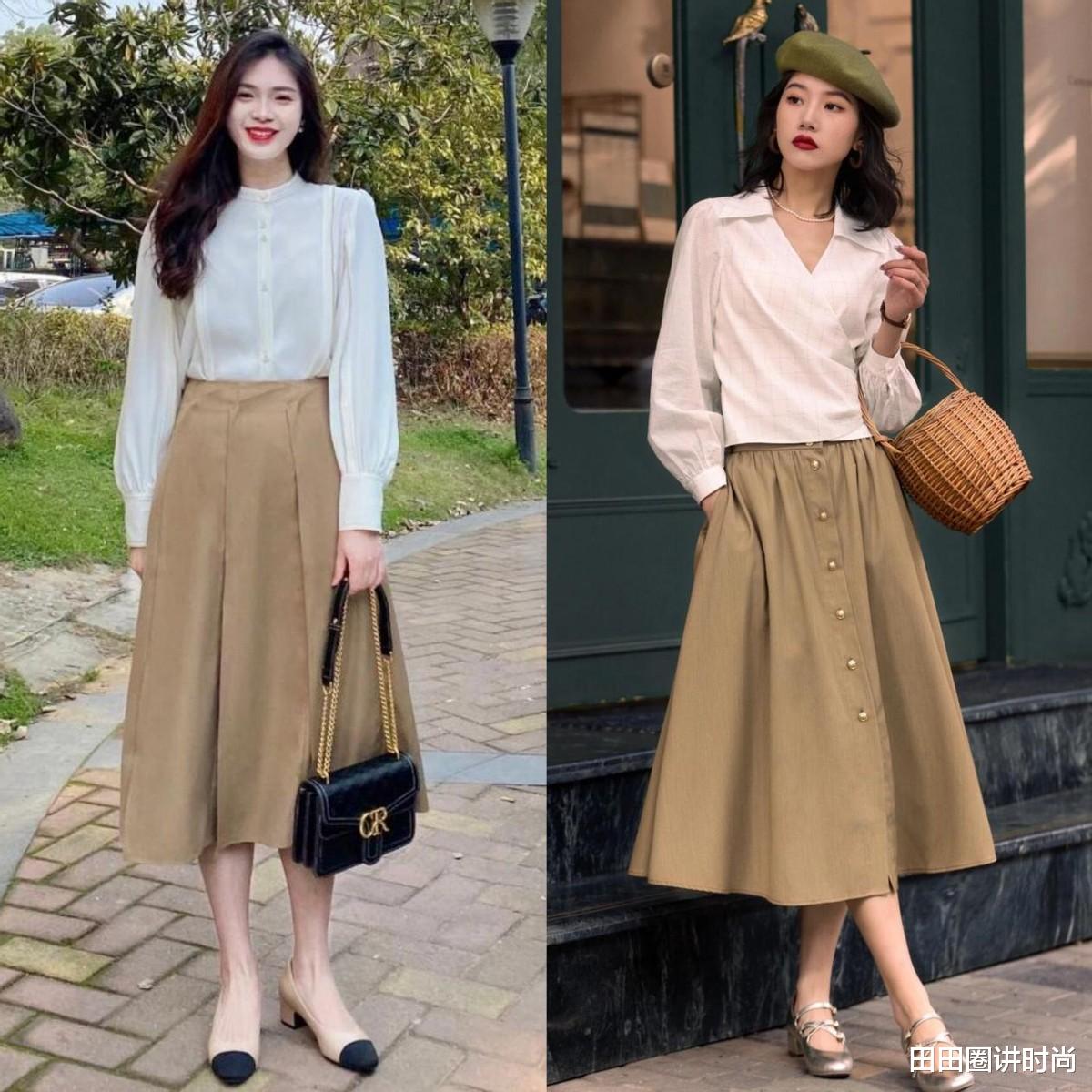 白衬衫搭配卡其色的半身裙则自带复古感,这种卡其色的半身裙时尚度高,设计简洁,整体搭配看起来利落有型,再结合一双浅口单鞋,会更有女人味。
