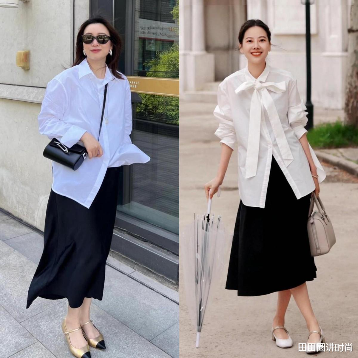 宽松型的白衬衫风格则更加随性洒脱,搭配黑色的半身裙,整个造型松弛感满满,然后搭配时髦的低跟鞋拉伸比例,谁穿谁好看。