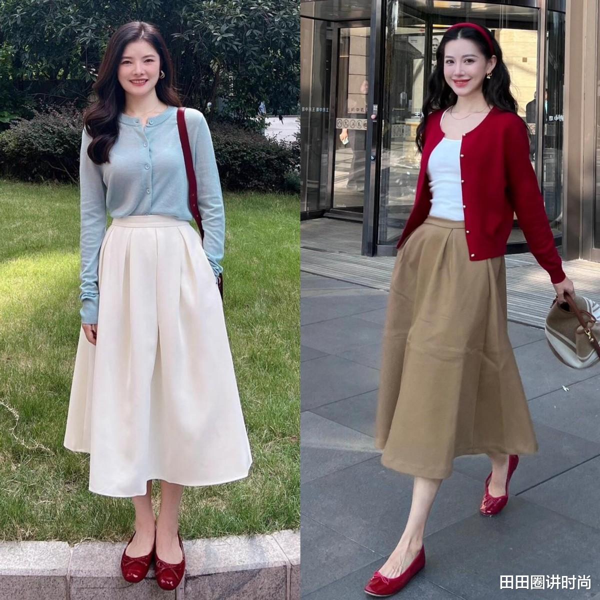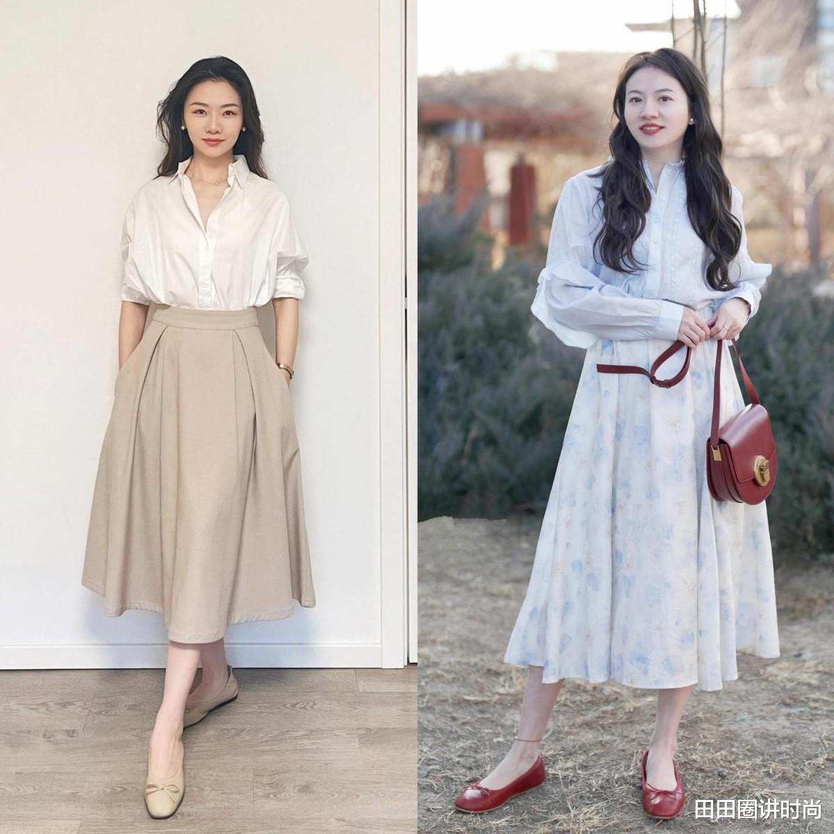 第一,半身裙搭配小低跟和平底鞋,舒适时髦并存
