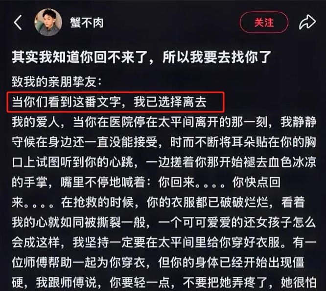 4月11日,广东33岁男子谢家振离世的消息引发全网关注。在其社交账号"蟹不肉"发布的绝笔信中,这位痴情丈夫表露了追随亡妻而去的决心。随着事件发酵,更多感人细节逐渐浮出水面。