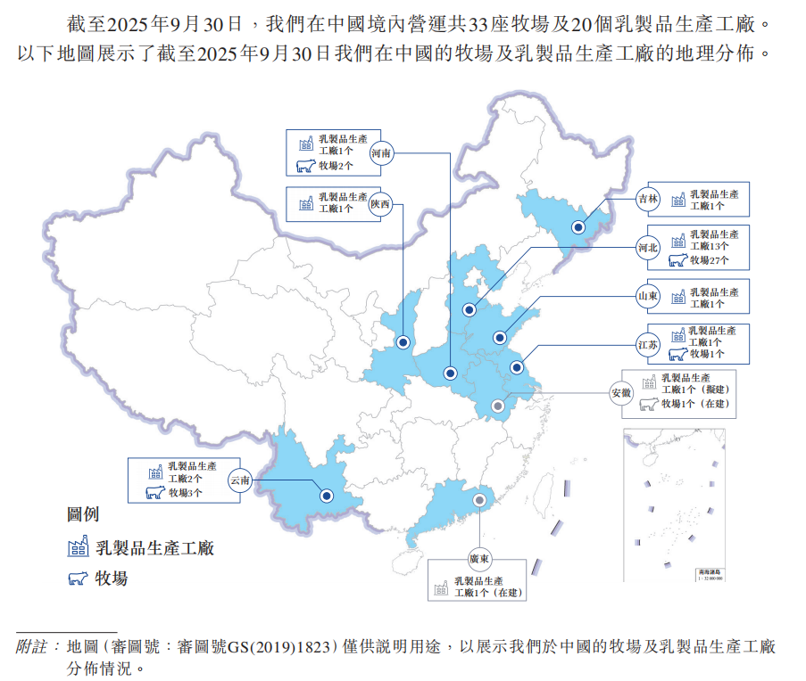 截至2025年9月30日,君乐宝在全国运营33座自营牧场,20家工厂,奶源自给率达66%,为国内大型综合乳企中最高的。牧场主要分布在河北、云南、河南、江苏四省。河北作为大本营拥有27座牧场,设计存栏量18.03万头,成母牛数量8.24万头,后备牛及犊牛7.67万头,是公司核心奶源基地。