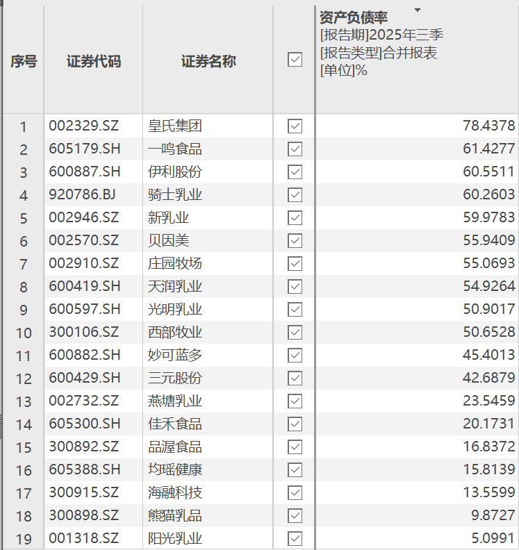 截至2025年三季度末,A股上市乳企中,资产负债率最高的皇氏集团为78.44%,与君乐宝接近。一鸣食品、伊利股份分别为61.43%、60.55%。同行负债率大多集中在40%—60%区间。