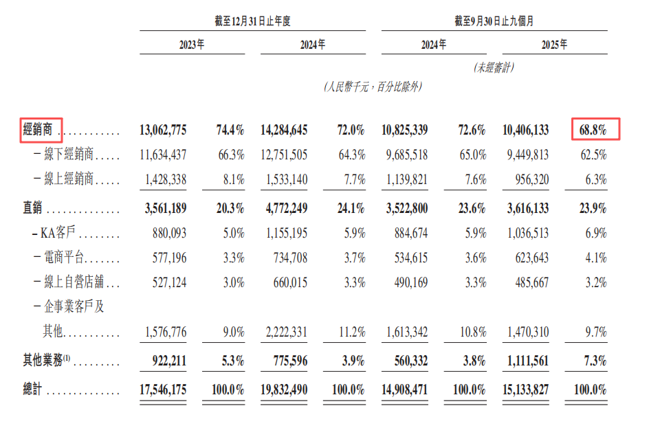 截至2025年9月30日,君乐宝经销商总数5504家,较2023年末的6068家减少了9.3%。2025年前三季度,君乐宝新增经销商959家,同期终止合作1066家,净减少107家。经由经销商贡献的营收占比从2023年的74.4%降至2025年前三季度的68.8%。