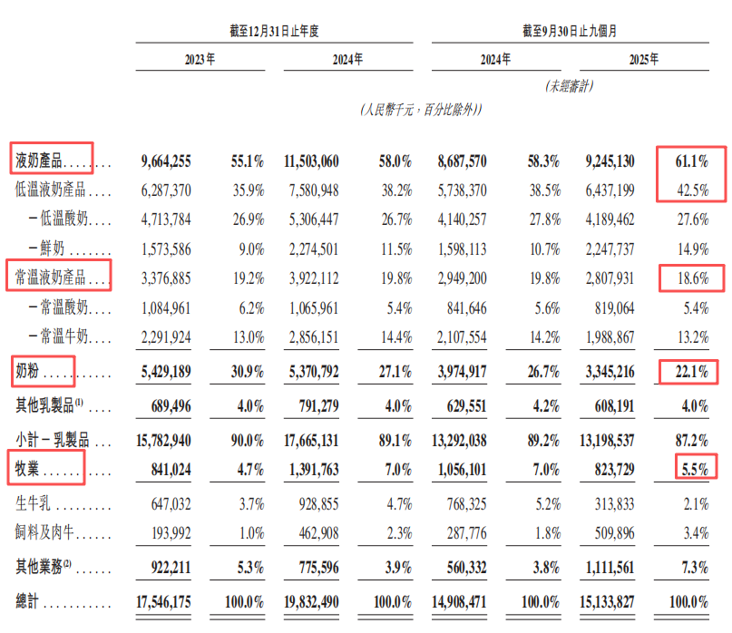 2025年前三季度,低温液奶营收64.37亿元,占比从2024年同期的38.5%提升至42.5%。其中低温酸奶营收41.89亿元,营收占比27.6%,基本持平;鲜奶业务表现亮眼,营收22.47亿元,同比增12.7%,占比从10.7%提升至14.9%。