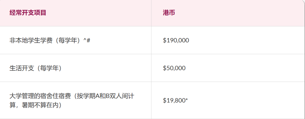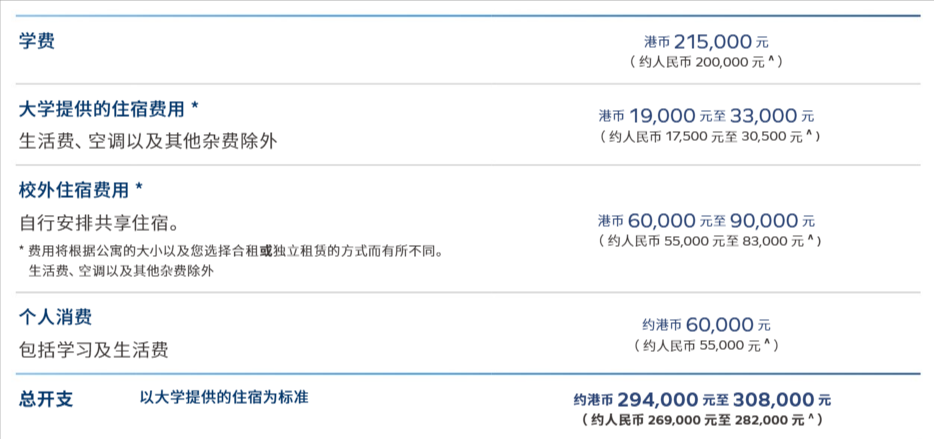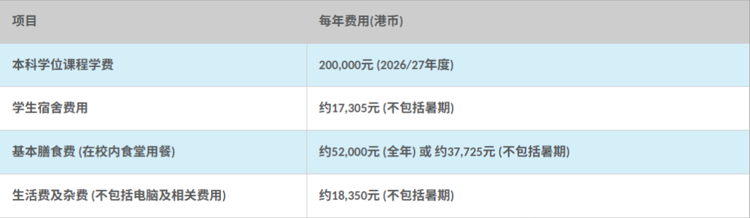 2026/27学年全年学费为港币190,000元,分上、下学期缴交。该费用日后或会调整,大学将另行通告。