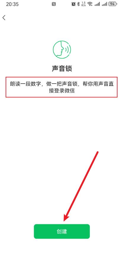 第四步:接着就能看到底部有一个【创建】的按钮,上面能看到提示“朗读一段数字,做一把声音锁,帮你用声音直接登录微信”,如下图所示: