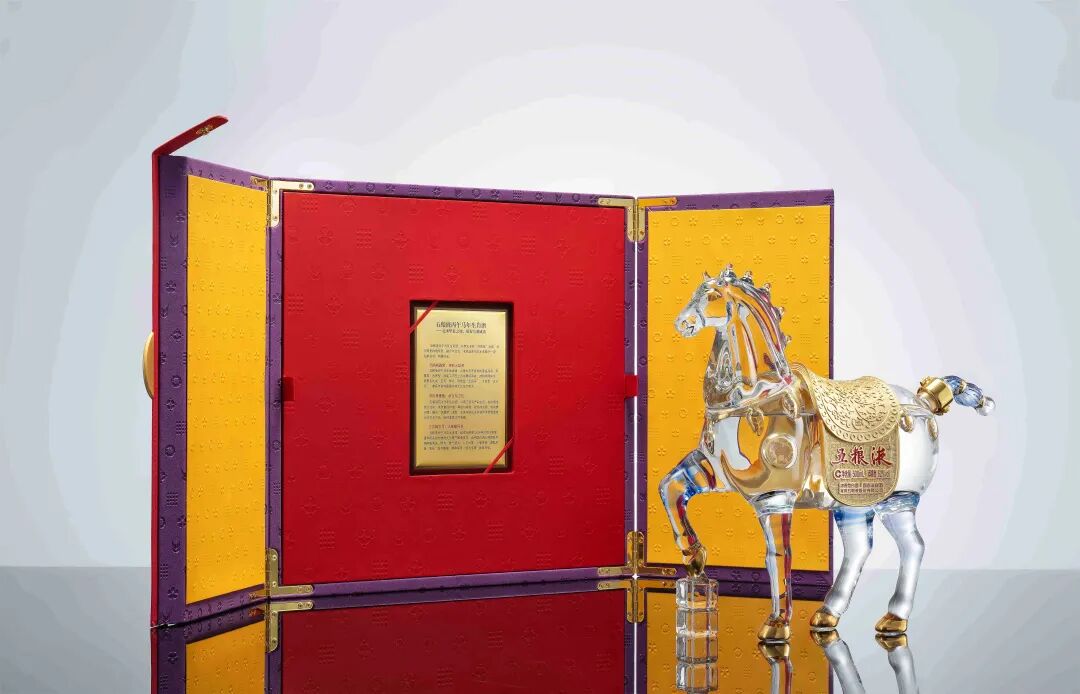 五粮液五粮液·丙午马年生肖酒(下图)以唐太宗李世民传奇战马“昭陵六骏”之首——“飒露紫”为原型,采用水晶玻璃材质纯手工打造,历经100次以上锻造与1600度高温淬炼,运用“双色渐变玻璃工艺”点缀蓝紫色鬃毛与四肢,鬃毛采用唐代最高等级“五花”样式,马鞍饰以宝相花+五谷纹,马栓刻“马到成功”印章,描金工艺也更凸显高端质感。