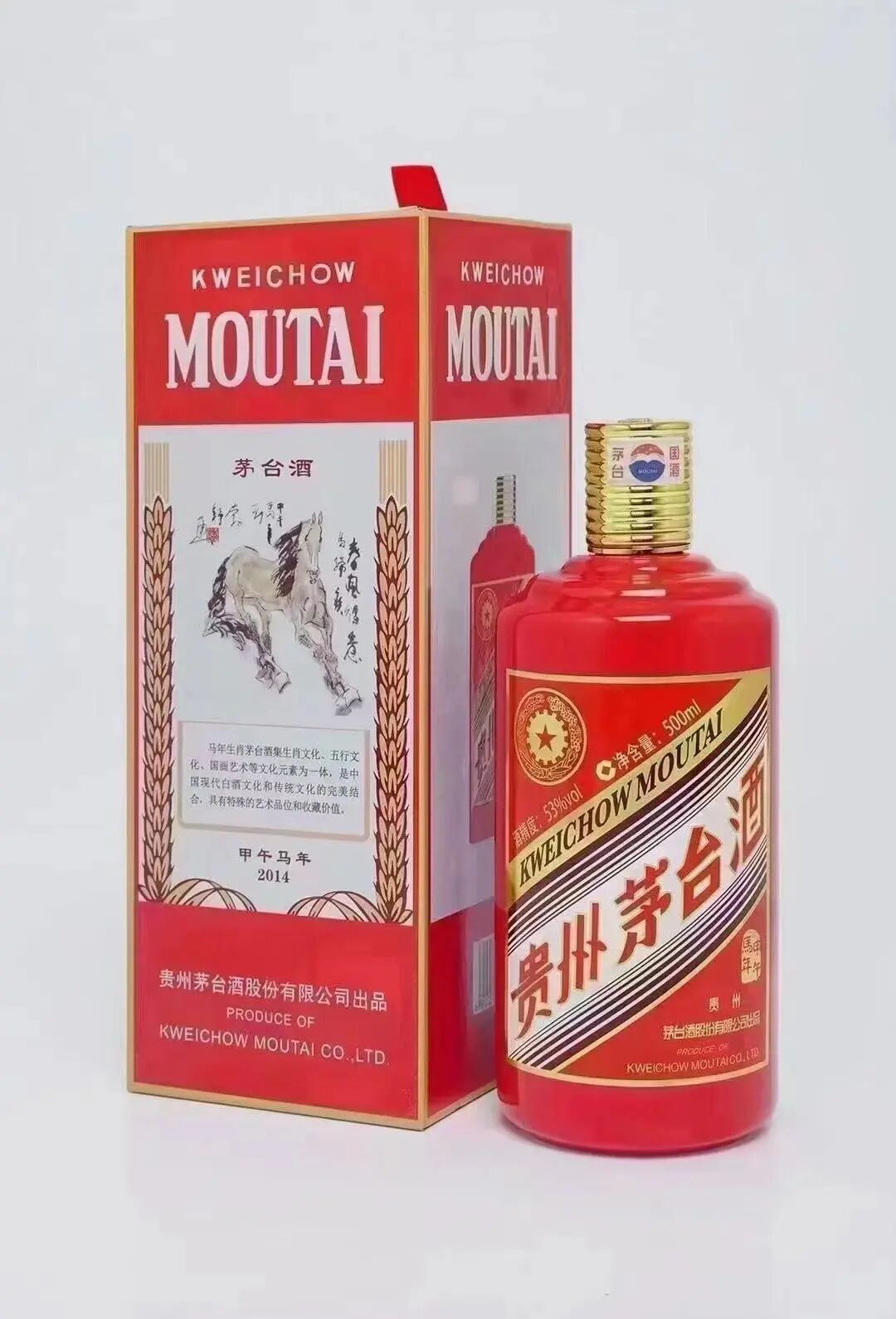 2014年甲午马年茅台作为生肖系列第一个作品,设计融合国画大师徐悲鸿弟子刘勃舒的《春风得意马蹄疾》与书法家冯国语的墨宝,极具艺术价值,市场稀缺性高。